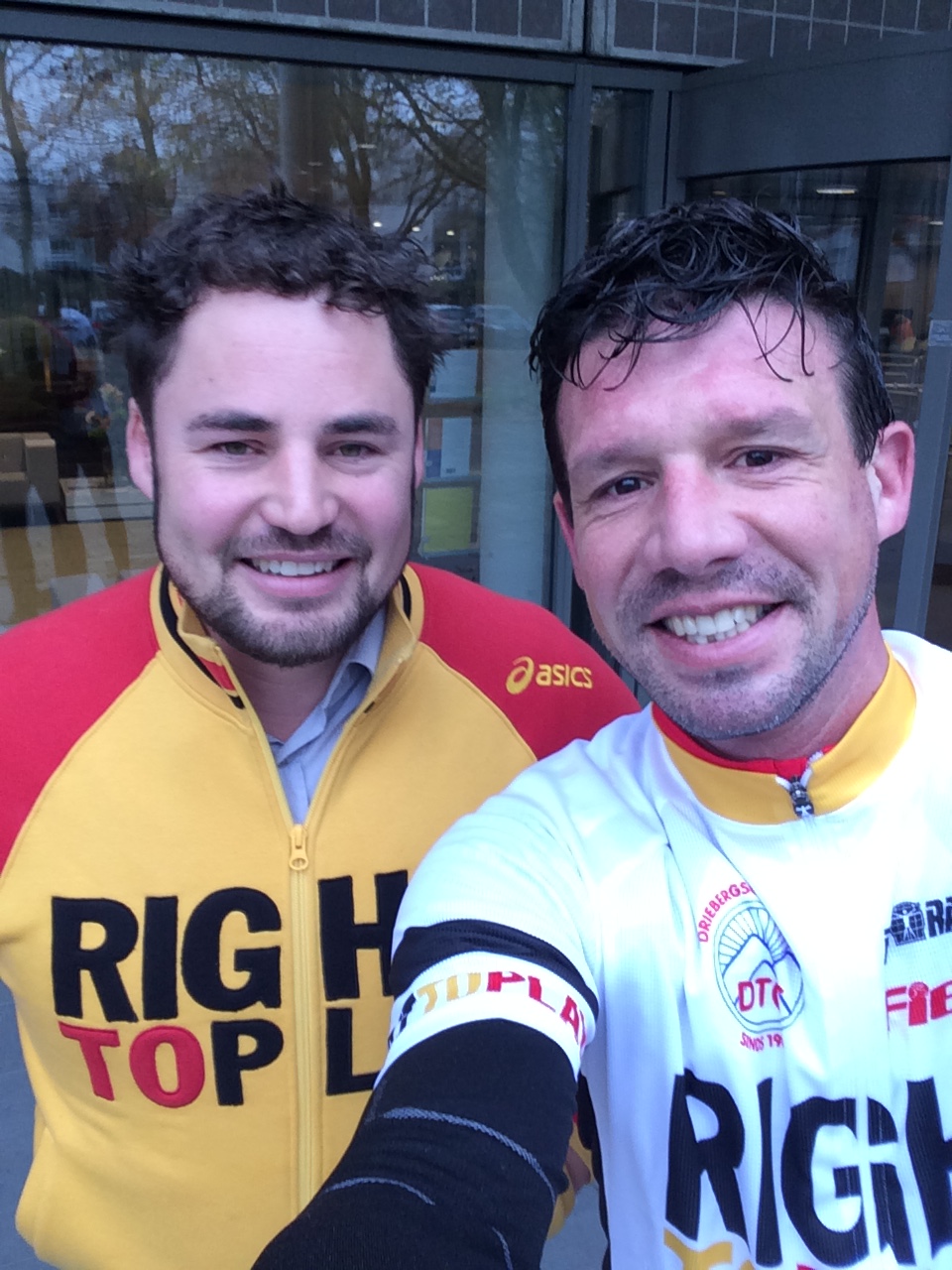 Ik meld me bij de balie en de keurig geklede dame vertelt me dat Bram er zo aan komt. Dat was het tweede ‘lullige’ moment van de dag. Sta je daar in je wielerkleding tussen allemaal mensen in maat- en mantelpakken. Gelukkig duurt het niet heel lang voor Bram er is. Hij vertelt ronduit over zijn werk, hij begeleidt topsporters die na hun sportcarrière een baan in de maatschappij zoeken en informeert de bedrijven die sporters aannemen over de mogelijkheden, de mitsen en de maren. Echt leuk trouwens om te merken hoe enthousiast hij is over mijn actie. Ik vertel er kort over. Omdat ik niet heel veel tijd van hem wil afsnoepen (en het best koud optrekt in mijn sportpakje), stel ik voor de selfie te maken.