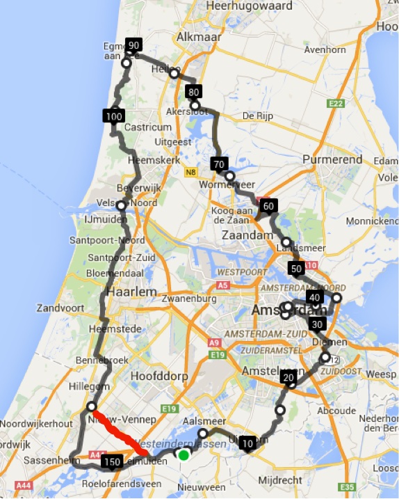 Na een klein uurtje rijden parkeer ik mijn auto bij de plaatselijke tennisbaan en start aan mijn rondje Noord-Holland. Ik heb in Strava 159 km uitgezet. Slim he, zo haal ik mijn challenge van een rondje van minimaal 100 km door de provincie EN een rondje boven de 150 km. Twee vliegen in één klap dus. Om de mep helemaal aan te laten komen, heb ik ook een tussenstop gepland in Diemen, bij een gigantisch kantoor van Randstad. Daar werkt Bram Ronnes, die als beach volleyballer mee heeft gedaan aan de Olympische Spelen in Bejing (2008).