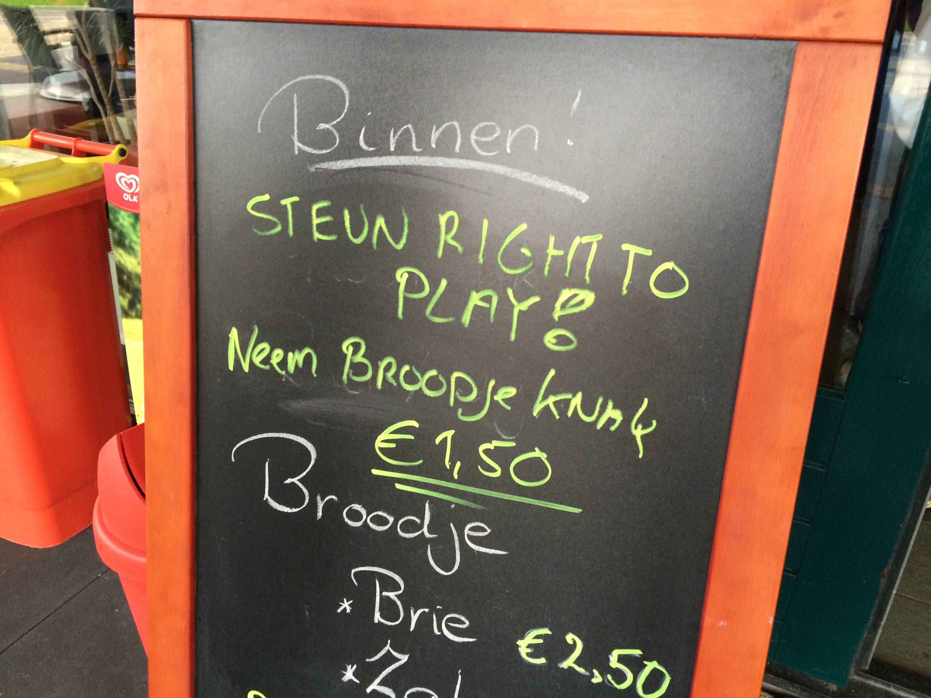 Na een half uurtje chocola eten in de auto en turen op buienradar, kwam Sharon, mijn collega van de dag, keurig op tijd in het Right To Play busje aangereden. Na een kort voorstel rondje aan de organisatoren van LTC Triomf gingen we aan de slag om de stand en de spelletjes klaar te zetten. Right To Play was het goede doel van dit toernooi en wij zouden buiten spelletjes doen met de kinderen en informatie geven over Right To Play, daar waar nodig. Binnen werden ‘Right To Play broodjes’ verkocht en alles wat we zouden ophalen met de spelletjes en de broodjes werd gedoneerd aan ons goede doel.