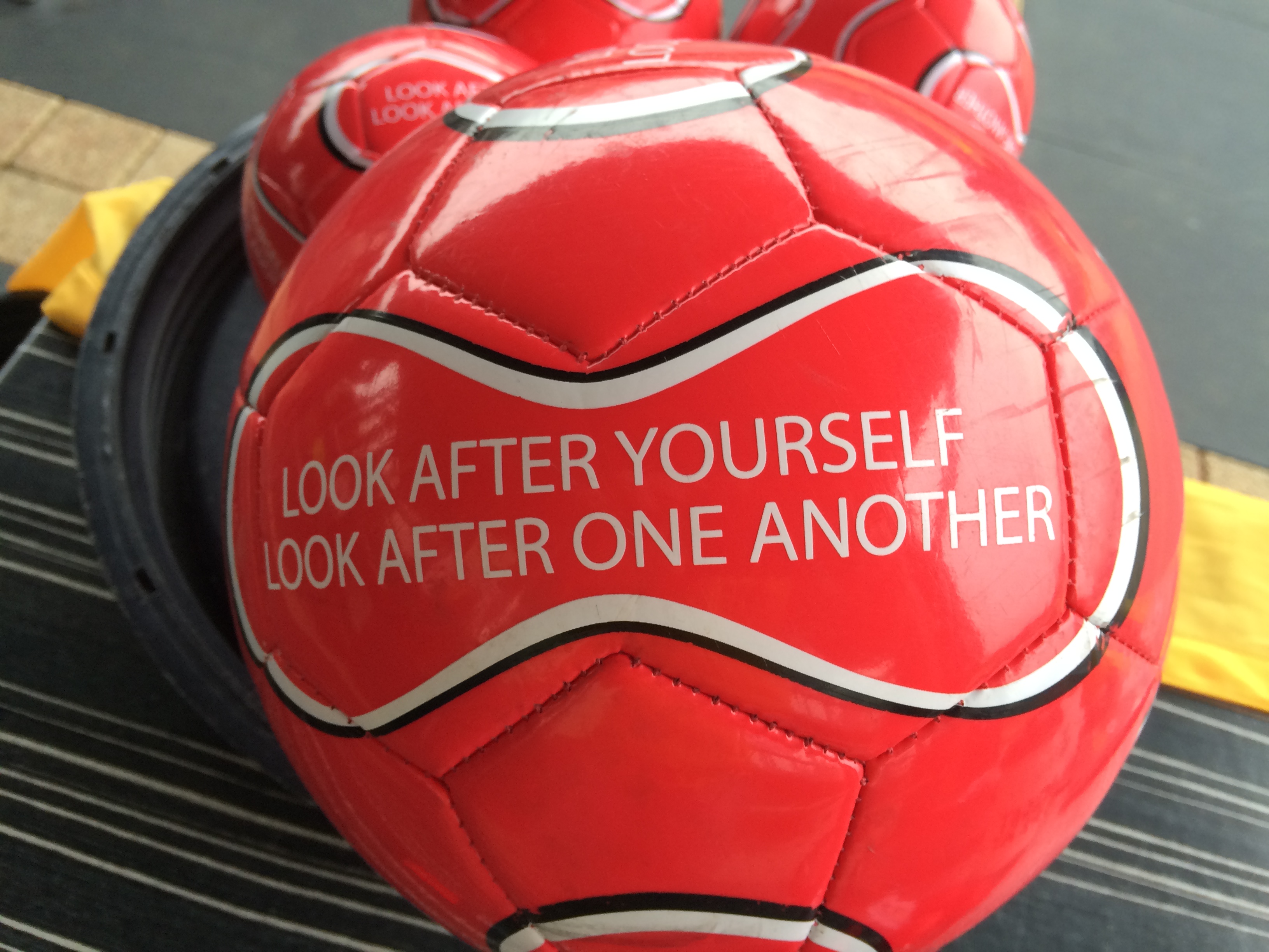 Gelukkig stond er in het tochtgat waar we stonden maar een kleine windkracht zes, zodat we slechts 50 minuten nodig hadden om wat banners, een zeil met gaten en onze stand op te bouwen. De spelletjes die we zouden gaan doen waren: voetbal hooghouden, basketballen en een klein Right To Play balletje hooghouden met de zijkant van je tennisracket.