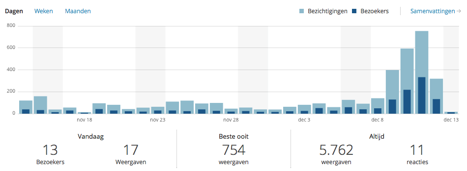 Eén van mijn belangrijke doelstellingen met deze 52 Charity Challenge is, om de naamsbekendheid van Right To Play te vergroten. Ik wil heel graag uitleggen wie we zijn, wat we doen, waarom we dat doen en hoe we dat doen. Het filmpje dat ik gisteren gepost heb, legt dat in twee en een halve minuut heel beeldend uit. Het was wel super gaaf om te zien dat na de kick off van de kerstviering op de Pabo in Den Bosch, mijn bezoekers aantallen als een raket omhoog schoten. Veel aandacht dus voor Right To Play. Berichten werden via Facebook, Twitter en andere platformen driftig gedeeld en voor ik het wist had ik een bereik van bijna 3.000 mensen, echt super. Hieronder is goed te zien wat de kick-off op de PABO teweeg bracht.