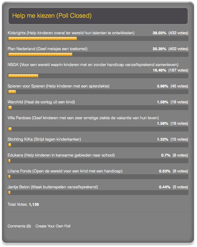 Op de eerste plaats was er de strijd om het volgende goede doel dat ik ga steunen. Voor challenge 13 is het de bedoeling, dat ik dit jaar vijf andere goede doelen ga steunen naast Right To Play. Ik steun Unicef en Cliniclowns al maandelijks, dus het werd tijd voor een derde doel. Op 6 december had ik een poll uitgezet met daarin een aantal doelen waarin kinderen centraal staan. Ik had via Twitter alle betrokken non-profit organisaties op de hoogte gesteld van de poll en de challenge en wat is het dan gaaf om te zien dat er achter elke ‘club’ wel een aantal ‘fanatiekelingen’ zitten zoals … uhhh … ikzelf. Natuurlijk kreeg ik ook reacties via social media, dat sommige goede doelen ontbraken op mijn lijst. Ik heb al die doelen genoteerd en besloten dat er absoluut nog een volgende poll komt met ‘minder bekende’ kandidaten.