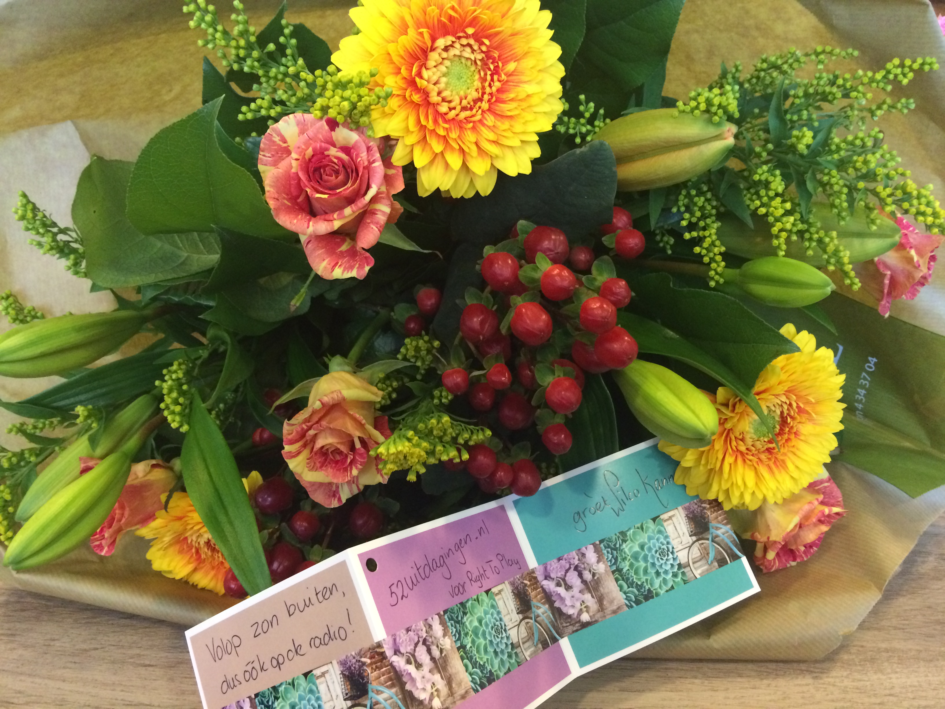 Sinds de zon zo uitbundig schijnt, heb ik ook echt de zomer in m’n bol. Dat deed me besluiten om mijn ‘entrance’ bij Omroep Vlaardingen wat vrolijker te maken dan normaal. Voor uitdaging 26 geef ik vijf keer zomaar een bloemetje weg en het leek me daarom een goed idee om voor ‘de mannen van de radio’ het zonnetje in huis te halen.