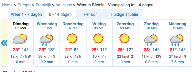 De stoom komt zo’n beetje uit mijn oren, maar ik besluit voor de XL versie te gaan. Als die echt te groot is, dan ga ik daarna wel in op de compensatie. En trouwens … als ik een beetje geluk heb, dan staat er een zuidenwind, als ik ga klimmen en dan kan een extra groot shirt als een zeil werken en word ik zo de berg op geblazen. Even de weersverwachting checken: