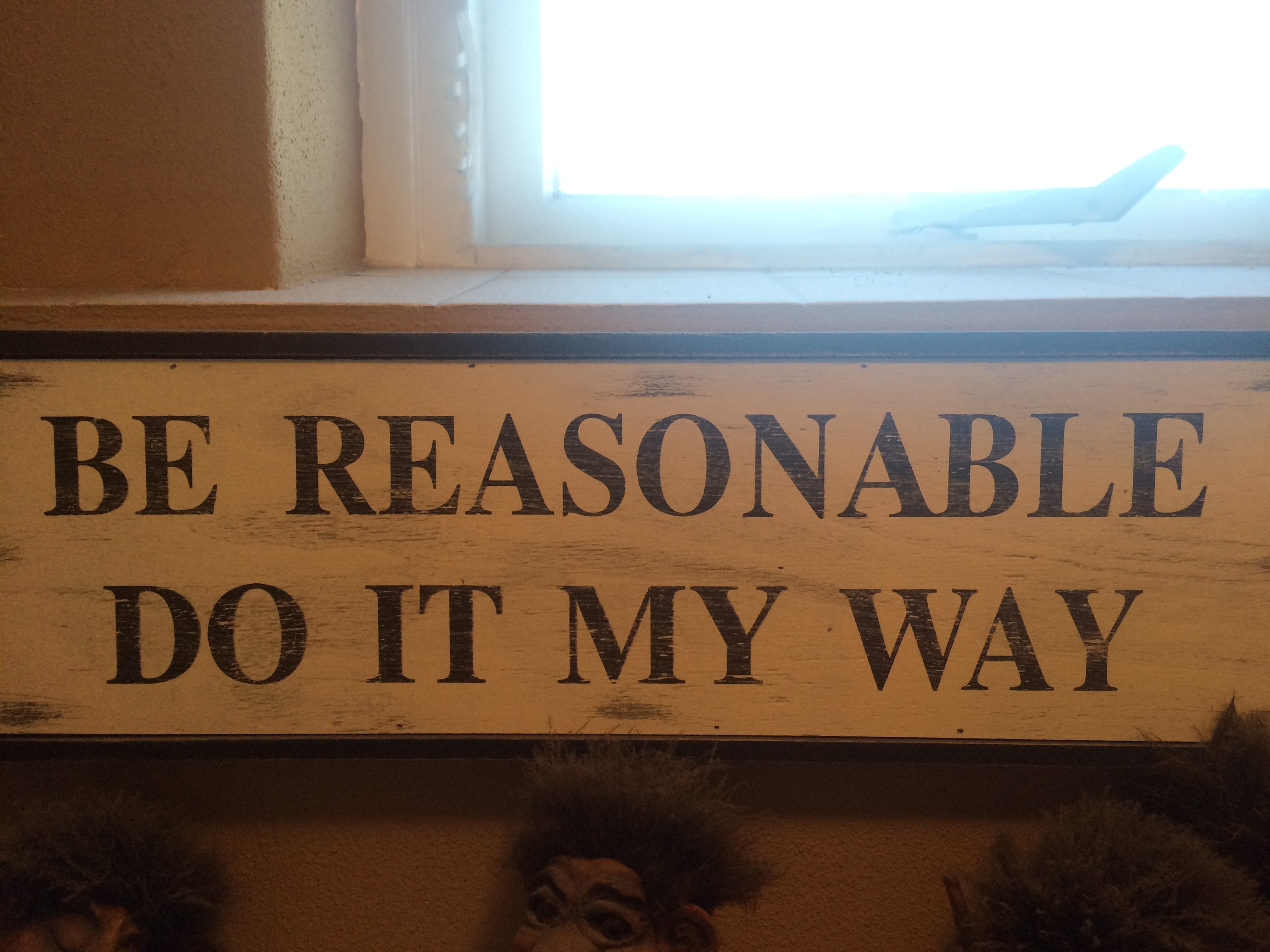 Met die dreigende teksten, rustend op veel te dunne spijkertjes, moest ik aan de slag. Ik zou het niet het zwaard van Damocles willen noemen, maar één verkeerde, te snelle beweging en de bordjes zouden onherroepelijk op me neerdalen. Met daarna natuurlijk spottend en lachend de verwijtende woorden van bovenaan de trap: ‘Zie je wel!’